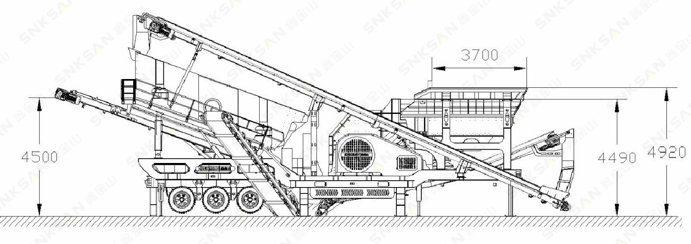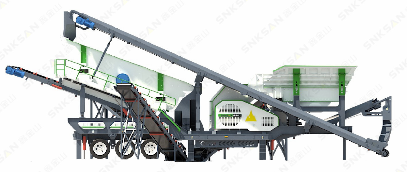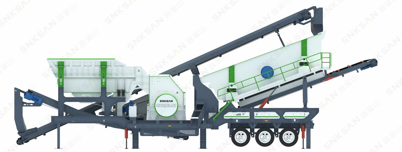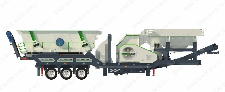 移動站整機配置給料機、錘破、振動篩和皮帶輸送機,集破碎、篩分、給料和物料輸送于一體,高度集成,是一個移動的小型生產(chǎn)線。
