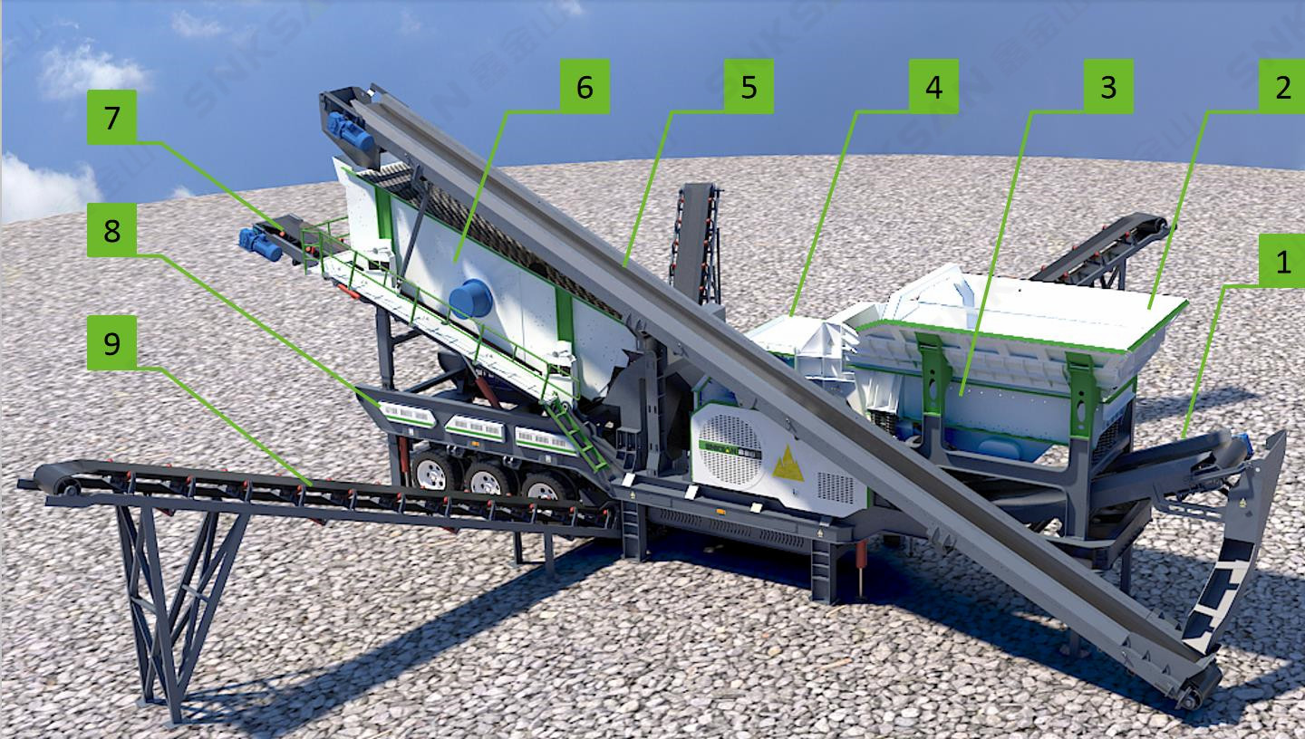 1、主皮帶機 2、料倉 3、給料機 4、錘破 5、上料皮帶機 6、振動篩 7、篩下皮帶機 8、車架 9、外掛皮帶機