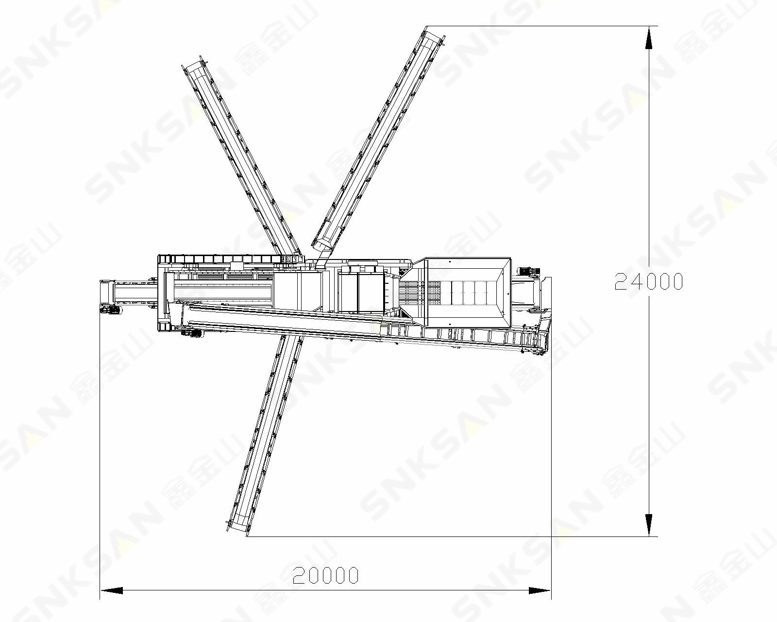 整機(含外掛皮帶機)工作時,占場地尺寸長20m*寬24m。程度節(jié)約了占地空間,適合場地空間狹小的現(xiàn)場。
